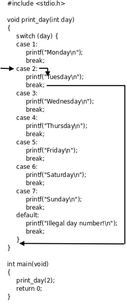 进入case后如果没有遇到break语句就会一直往下执行,后面其它case或default分支的语句也会被执行到,直到遇到break,或者执行到整个switch语句块的末尾。通常每个case后面都要加上break语句,但有时会故意不加break来利用这个特性,例如: